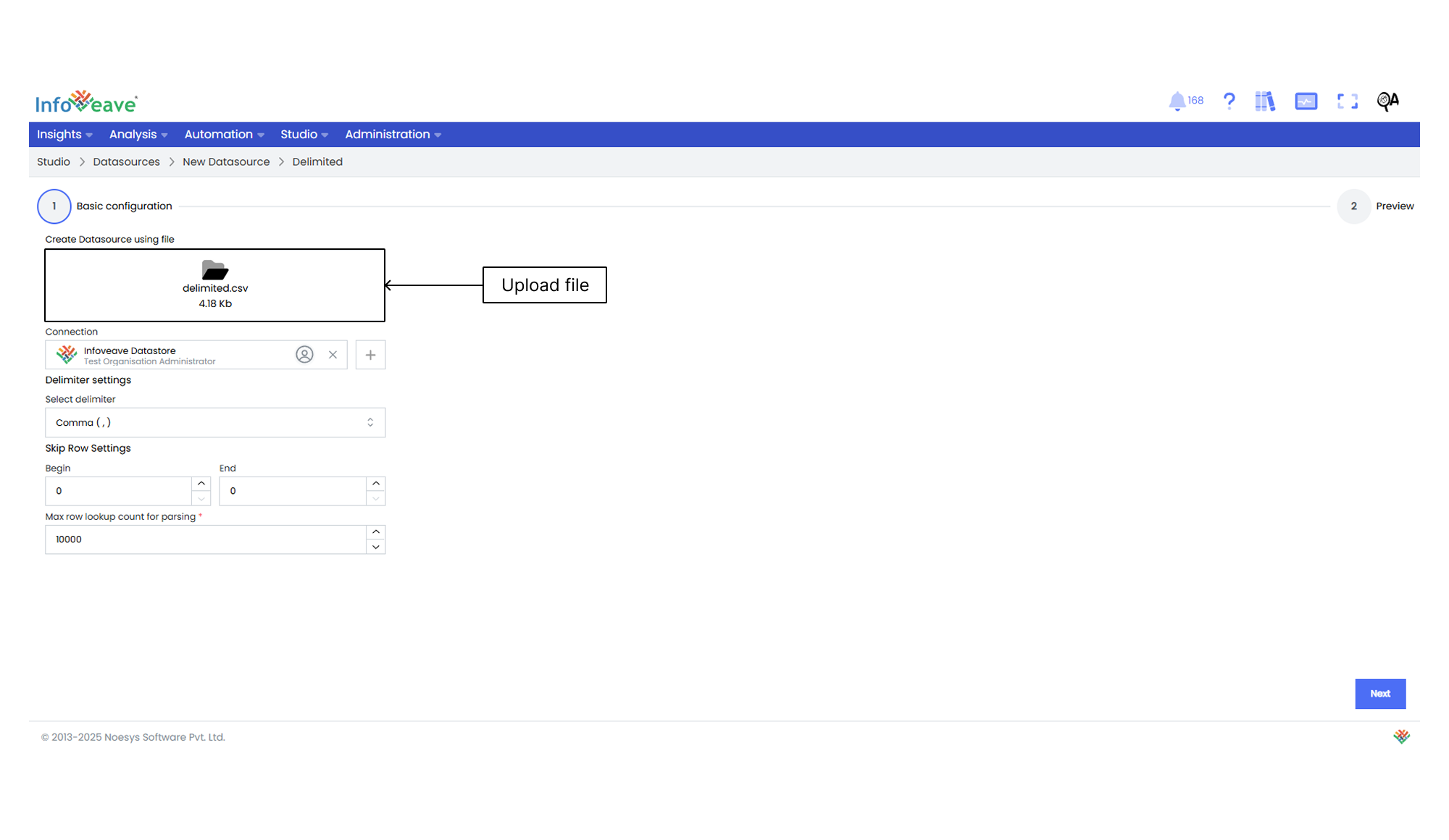 - Upload the delimited file from your local storage. Supported file formats include .csv, .tsv, and .txt.